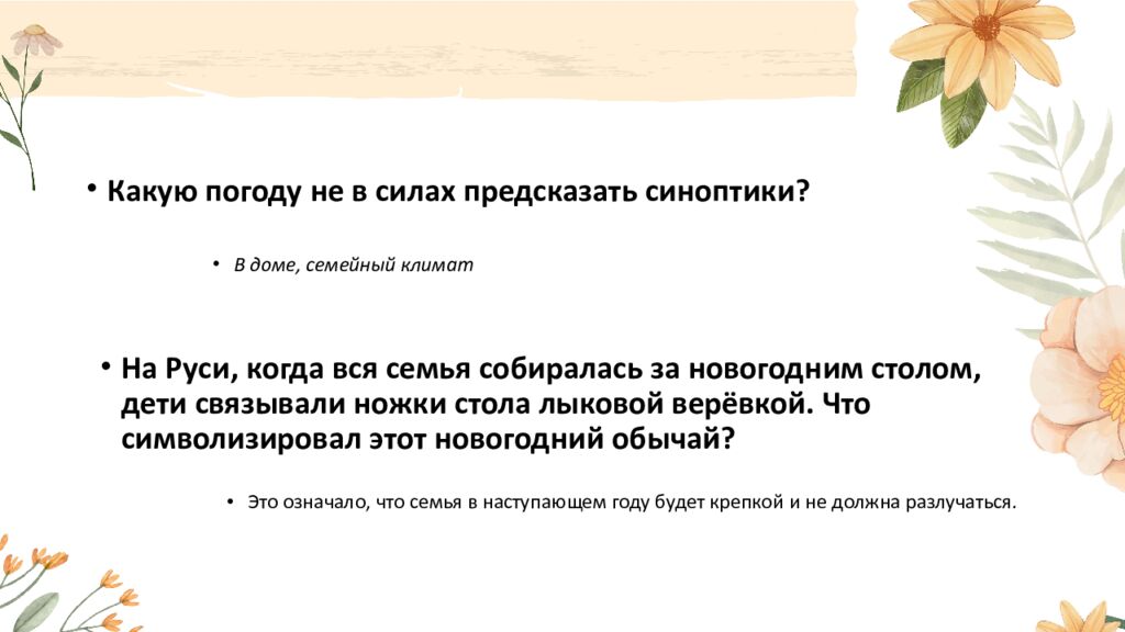 Какую погоду не в силах предсказать синоптики? В доме, семейный климат На Руси, когда вся семья собиралась за новогодним столом, дети связывали ножки стола лыковой верёвкой. Что символизировал этот новогодний обычай? Это означало, что семья в наступающем году будет крепкой и не должна разлучаться.