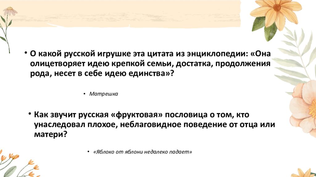 О какой русской игрушке эта цитата из энциклопедии: «Она олицетворяет идею крепкой семьи, достатка, продолжения рода, несет в себе идею единства»? Матрешка Как звучит русская «фруктовая» пословица о том, кто унаследовал плохое, неблаговидное поведение от отца или матери? «Яблоко от яблони недалеко падает»