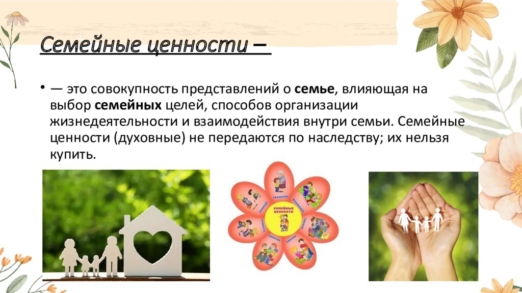 — это совокупность представлений о семье, влияющая на выбор семейных целей, способов организации жизнедеятельности и взаимодействия внутри семьи. Семейные ценности (духовные) не передаются по наследству; их нельзя купить.