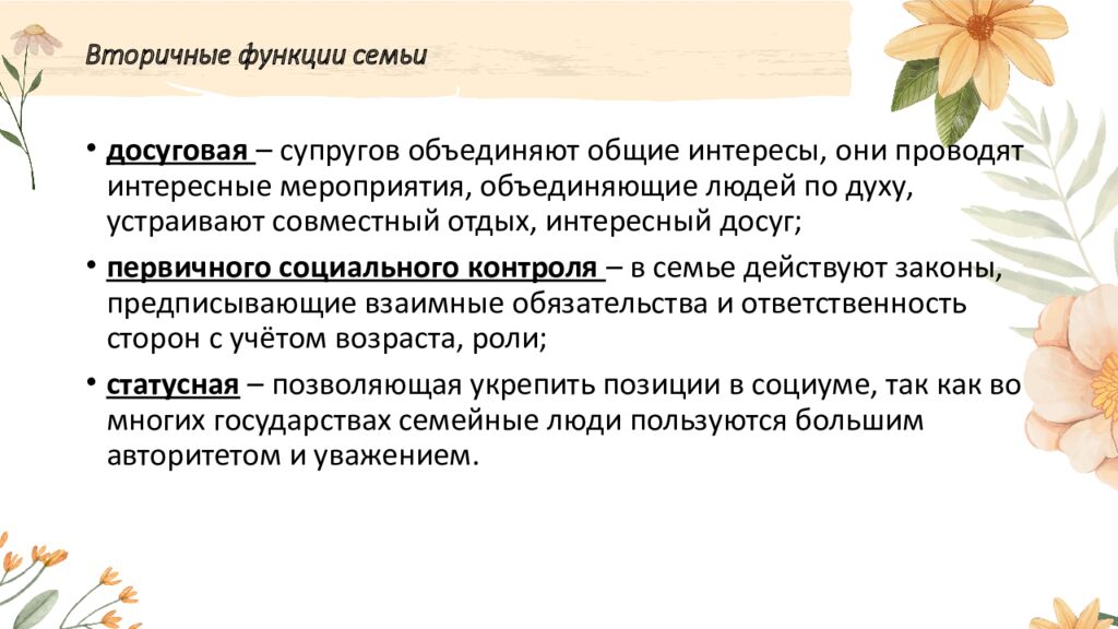 досуговая – супругов объединяют общие интересы, они проводят интересные мероприятия, объединяющие людей по духу, устраивают совместный отдых, интересный досуг; первичного социального контроля – в семье действуют законы, предписывающие взаимные обязательства и ответственность сторон с учётом возраста, роли; статусная – позволяющая укрепить позиции в социуме, так как во многих государствах семейные люди пользуются большим авторитетом и уважением.