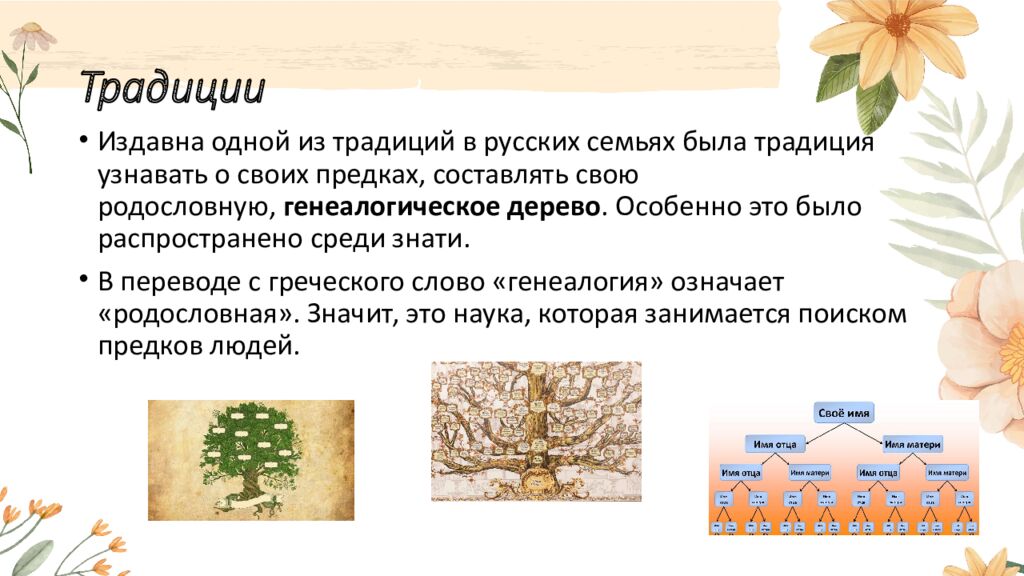 Издавна одной из традиций в русских семьях была традиция узнавать о своих предках, составлять свою родословную, генеалогическое дерево. Особенно это было распространено среди знати. В переводе с греческого слово «генеалогия» означает «родословная». Значит, это наука, которая занимается поиском предков людей.