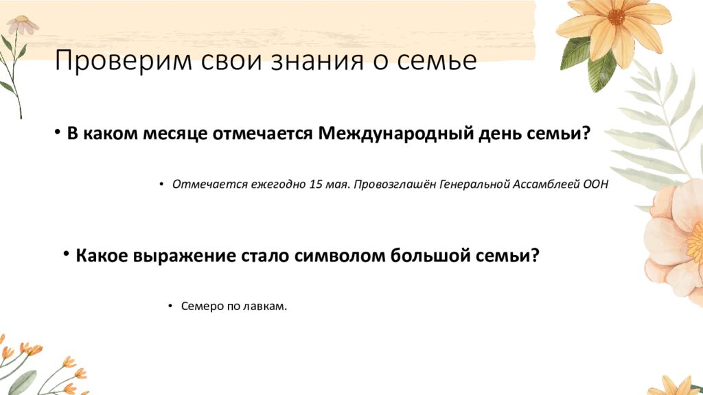 В каком месяце отмечается Международный день семьи? Отмечается ежегодно 15 мая. Провозглашён Генеральной Ассамблеей ООН Какое выражение стало символом большой семьи? Семеро по лавкам.