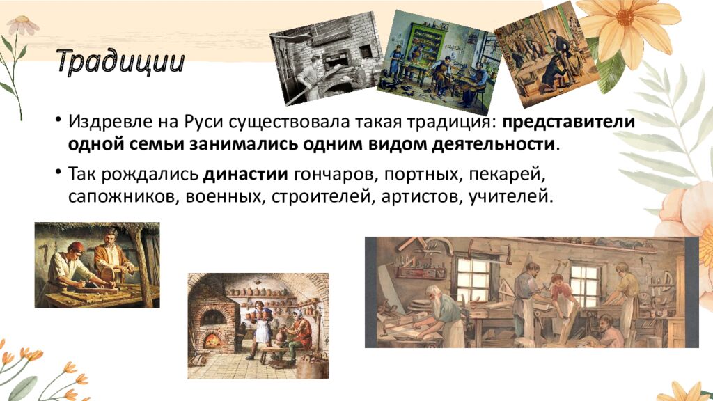 Издревле на Руси существовала такая традиция: представители одной семьи занимались одним видом деятельности. Так рождались династии гончаров, портных, пекарей, сапожников, военных, строителей, артистов, учителей.