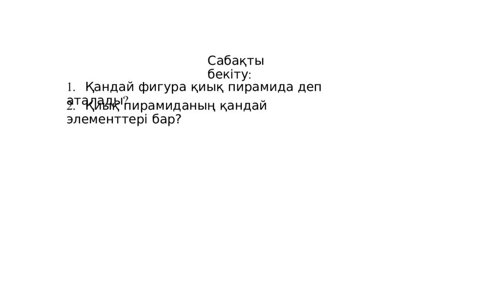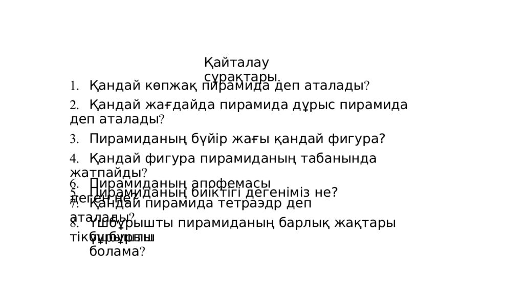 Қайталау сұрақтары. 1. Қандай көпжақ пирамида деп аталады ? 2. Қандай жағдайда пирамида дұрыс пирамида деп аталады ? 3. Пирамиданың бүйір жағы қандай фигура? 4. Қандай фигура пирамиданың табанында жатпайды ? 5. Пирамиданың биіктігі дегеніміз не? 6. Пирамиданың апофемасы деген не? 7. Қандай пирамида тетраэдр деп аталады ? 8. Үшбұрышты пирамиданың барлық жақтары тікбұрышты үшбұрыш болама ?