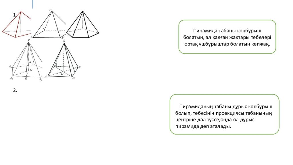 1. Пирамида - табаны көпбұрыш болатын, ал қалған жақтары төбелері ортақ үшбұрыштар болатын көпжақ. 2. Пирамиданың табаны дұрыс көпбұрыш болып, төбесінің проекциясы табанының центріне дәл түссе,онда ол дұрыс пирамида деп аталады.
