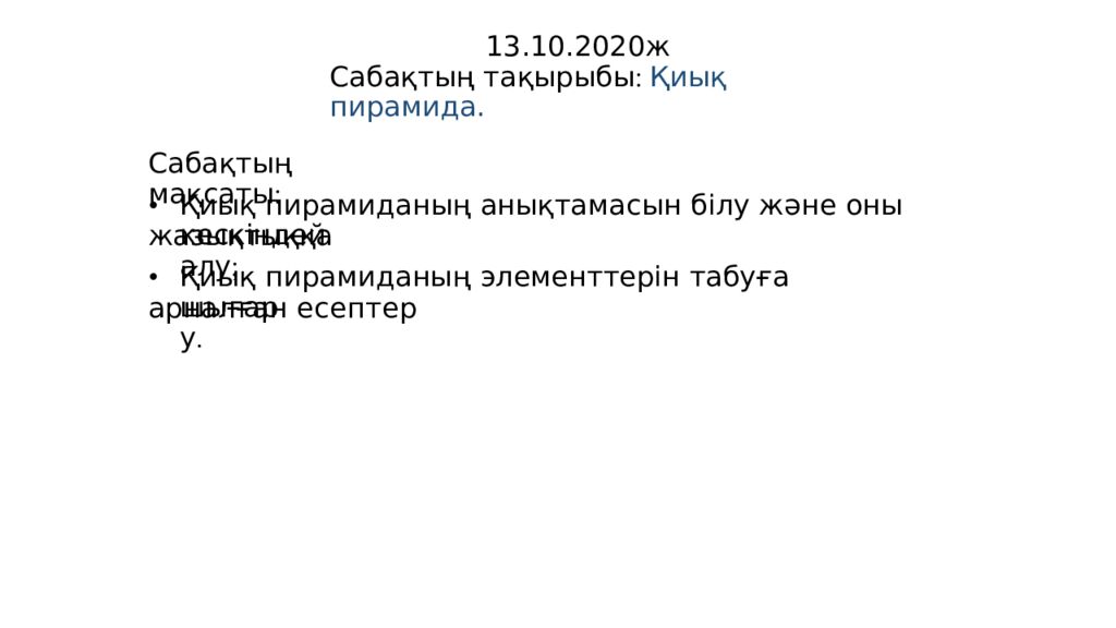 13.10.2020ж Сабақтың тақырыбы : Қиық пирамида. Сабақтың мақсаты : • Қиық пирамиданың анықтамасын білу және оны жазықтыққа кескіндей алу ; • Қиық пирамиданың элементтерін табуға арналған есептер шығару.