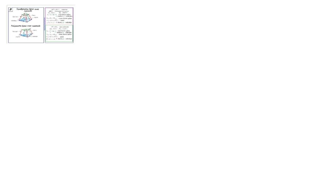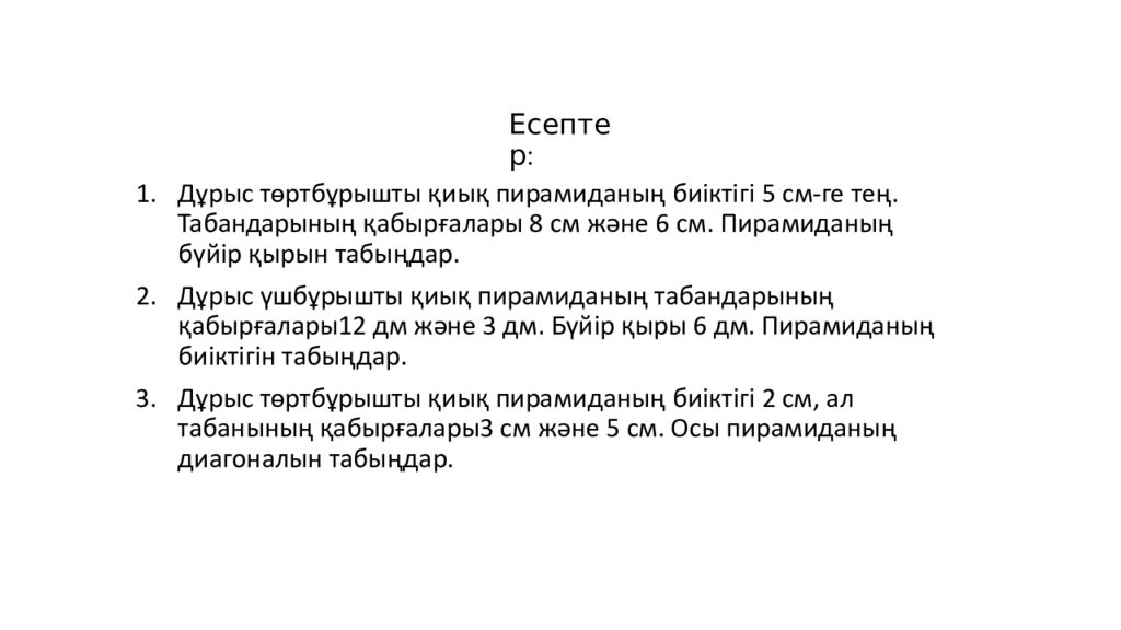 Есептер : 1. Дұрыс төртбұрышты қиық пирамиданың биіктігі 5 см - ге тең. Табандарының қабырғалары 8 см және 6 см. Пирамиданың бүйір қырын табыңдар. 2. Дұрыс үшбұрышты қиық пирамиданың табандарының қабырғалары12 дм және 3 дм. Бүйір қыры 6 дм. Пирамиданың биіктігін табыңдар. 3. Дұрыс төртбұрышты қиық пирамиданың биіктігі 2 см, ал табанының қабырғалары3 см және 5 см. Осы пирамиданың диагоналын табыңдар.