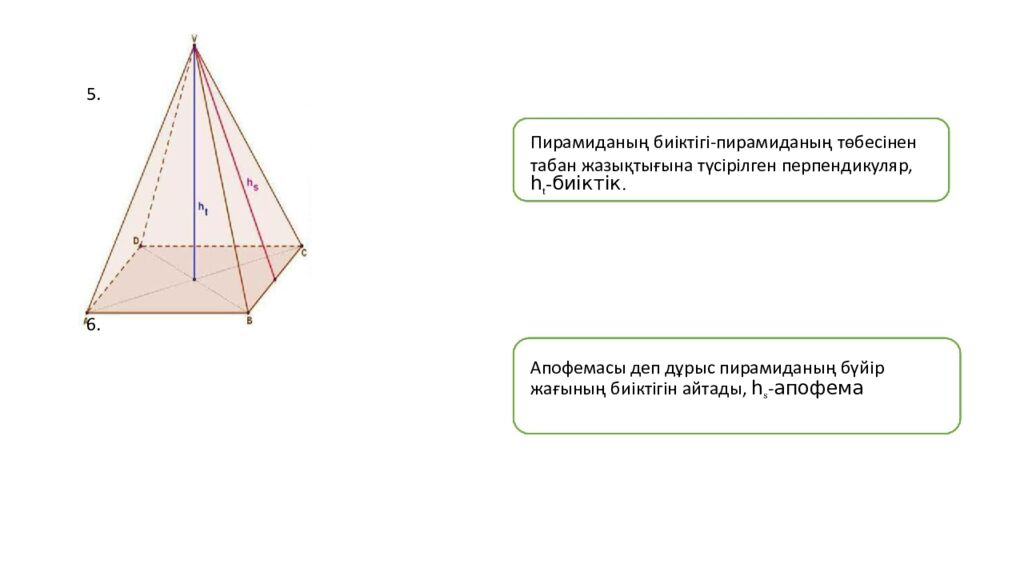 5. Пирамиданың биіктігі - пирамиданың төбесінен табан жазықтығына түсірілген перпендикуляр, һ t - биіктік. 6. Апофемасы деп дұрыс пирамиданың бүйір жағының биіктігін айтады, һ s - апофема
