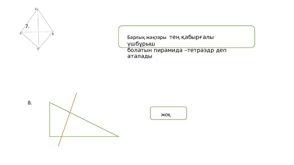 7. Барлық жақтары тең қабырғалы үшбұрыш болатын пирамида –тетраэдр деп аталады 8. жоқ