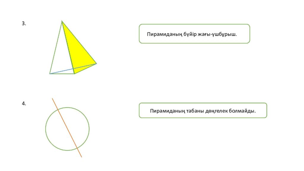 3. Пирамиданың бүйір жағы - үшбұрыш. 4. Пирамиданың табаны дөңгелек болмайды.
