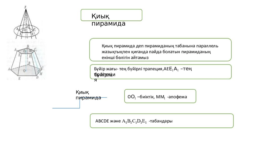 Қиық пирамида Қиық пирамида деп пирамиданың табанына параллель жазықтықпен қиғанда пайда болатын пирамиданың екінші бөлігін айтамыз Бүйір жағы - тең бүйірлі трапеция,АЕ Е А –тең бүйірлі 1 1 трапеция Қиық пирамида О О –биіктік, ММ - апофема 1 1 ABCDE және A B C D E - табандары 1 1 1 1 1