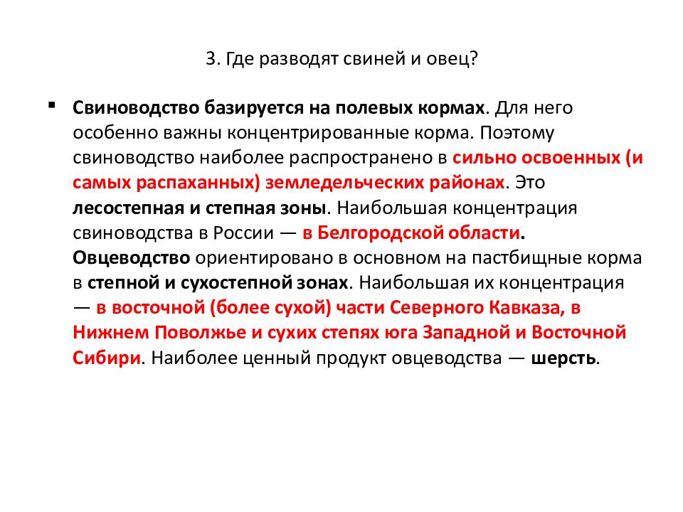 Свиноводство базируется на полевых кормах. Для него особенно важны концентрированные корма. Поэтому свиноводство наиболее распространено в сильно освоенных (и самых распаханных) земледельческих районах. Это лесостепная и степная зоны. Наибольшая концентрация свиноводства в России — в Белгородской области. Овцеводство ориентировано в основном на пастбищные корма в степной и сухостепной зонах. Наибольшая их концентрация — в восточной (более сухой) части Северного Кавказа, в Нижнем Поволжье и сухих степях юга Западной и Восточной Сибири. Наиболее ценный продукт овцеводства — шерсть.