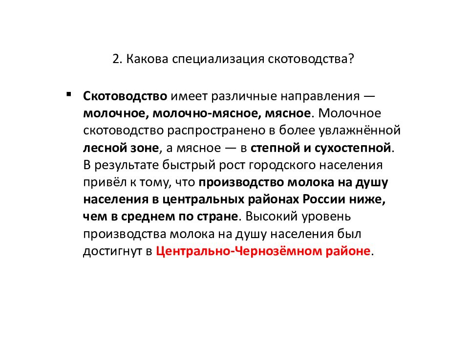 Скотоводство имеет различные направления — молочное, молочно-мясное, мясное. Молочное скотоводство распространено в более увлажнённой лесной зоне, а мясное — в степной и сухостепной. В результате быстрый рост городского населения привёл к тому, что производство молока на душу населения в центральных районах России ниже, чем в среднем по стране. Высокий уровень производства молока на душу населения был достигнут в Центрально-Чернозёмном районе.