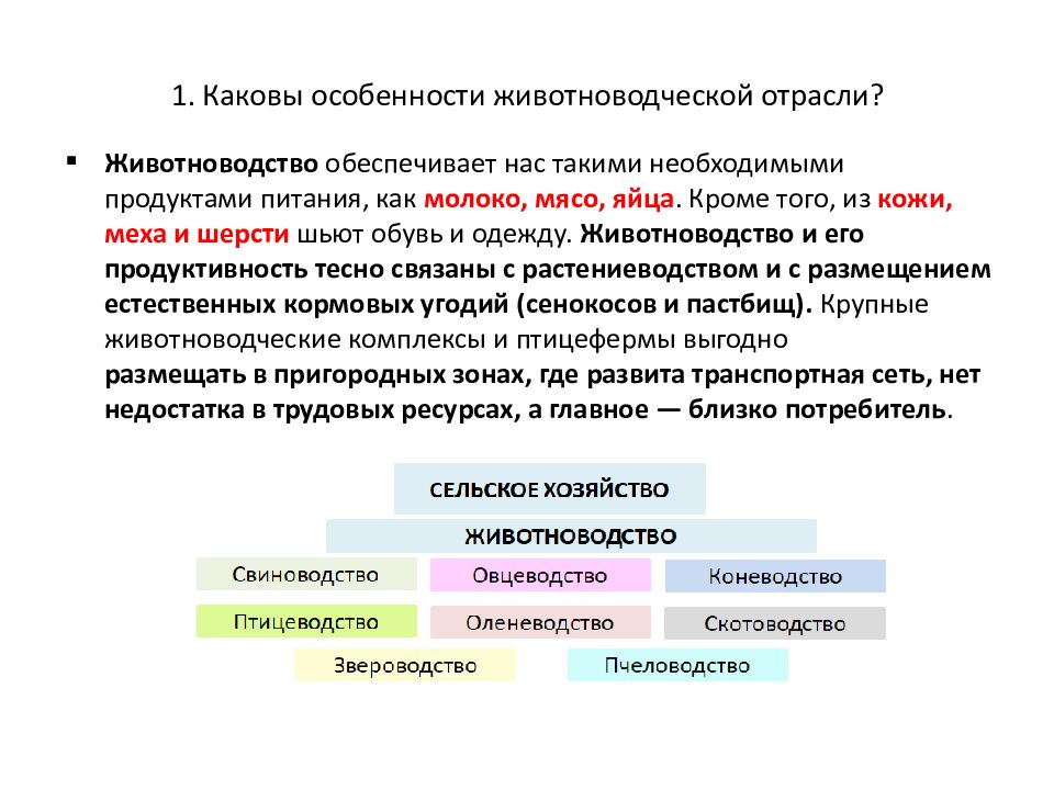 Животноводство обеспечивает нас такими необходимыми продуктами питания, как молоко, мясо, яйца. Кроме того, из кожи, меха и шерсти шьют обувь и одежду. Ж ивотноводство и его продуктивность тесно связаны с растениеводством и с размещением естественных кормовых угодий (сенокосов и пастбищ ). К рупные животноводческие комплексы и птицефермы выгодно размещать в пригородных зонах, где развита транспортная сеть, нет недостатка в трудовых ресурсах, а главное — близко потребитель.