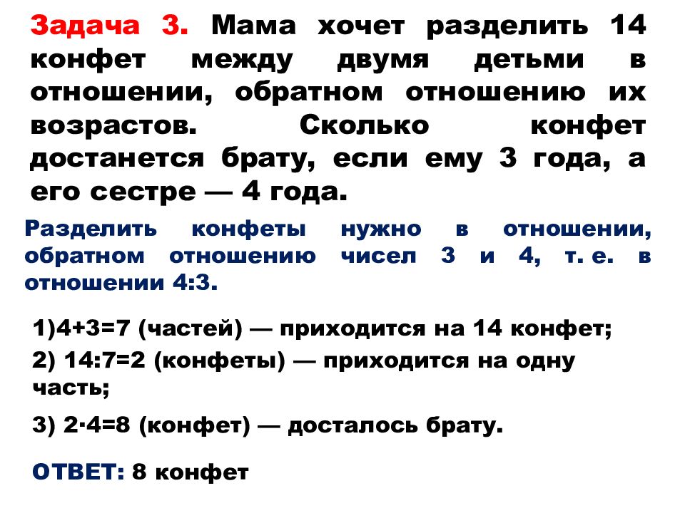 Задача 3. Мама хочет разделить 14 конфет между двумя детьми в отношении, обратном отношению их возрастов. Сколько конфет достанется брату, если ему 3 года, а его сестре — 4 года. Разделить конфеты нужно в отношении, обратном отношению чисел 3 и 4, т. е. в отношении 4:3. 1)4+3=7 (частей) — приходится на 14 конфет; 2) 14:7=2 (конфеты) — приходится на одну часть; 3) 2 ·4=8 (конфет) — досталось брату. ОТВЕТ: 8 конфет