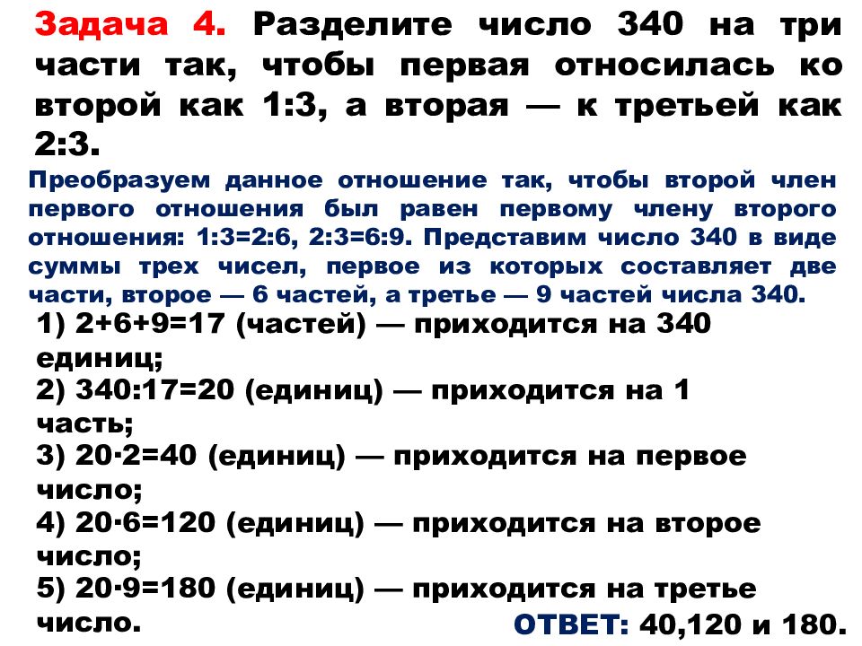 Задача 4. Разделите число 340 на три части так, чтобы первая относилась ко второй как 1:3, а вторая — к третьей как 2:3. Преобразуем данное отношение так, чтобы второй член первого отношения был равен первому члену второго отношения: 1:3=2:6, 2:3=6:9. Представим число 340 в виде суммы трех чисел, первое из которых составляет две части, второе — 6 частей, а третье — 9 частей числа 340. 1) 2+6+9=17 (частей) — приходится на 340 единиц; 2) 340:17=20 (единиц) — приходится на 1 часть; 3) 20 ·2=40 (единиц) — приходится на первое число; 4) 20 ·6=120 (единиц) — приходится на второе число; 5) 20 ·9=180 (единиц) — приходится на третье число. ОТВЕТ: 40,120 и 180.