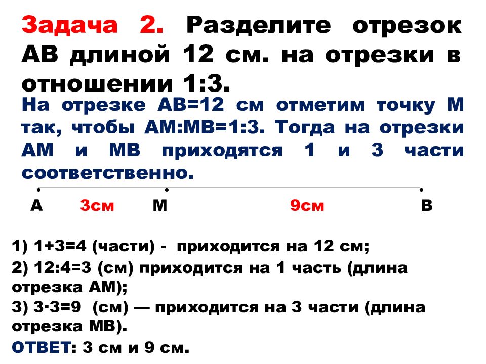 Задача 2. Разделите отрезок АВ длиной 12 см. на отрезки в отношении 1:3. На отрезке АВ=12 см отметим точку М так, чтобы АМ:МВ=1:3. Тогда на отрезки АМ и МВ приходятся 1 и 3 части соответственно. А 3см М 9см В • • • 1) 1+3=4 (части) - приходится на 12 см; 2) 12:4=3 (см) приходится на 1 часть (длина отрезка АМ); 3) 3 ·3=9 (см) — приходится на 3 части (длина отрезка МВ). ОТВЕТ : 3 см и 9 см.