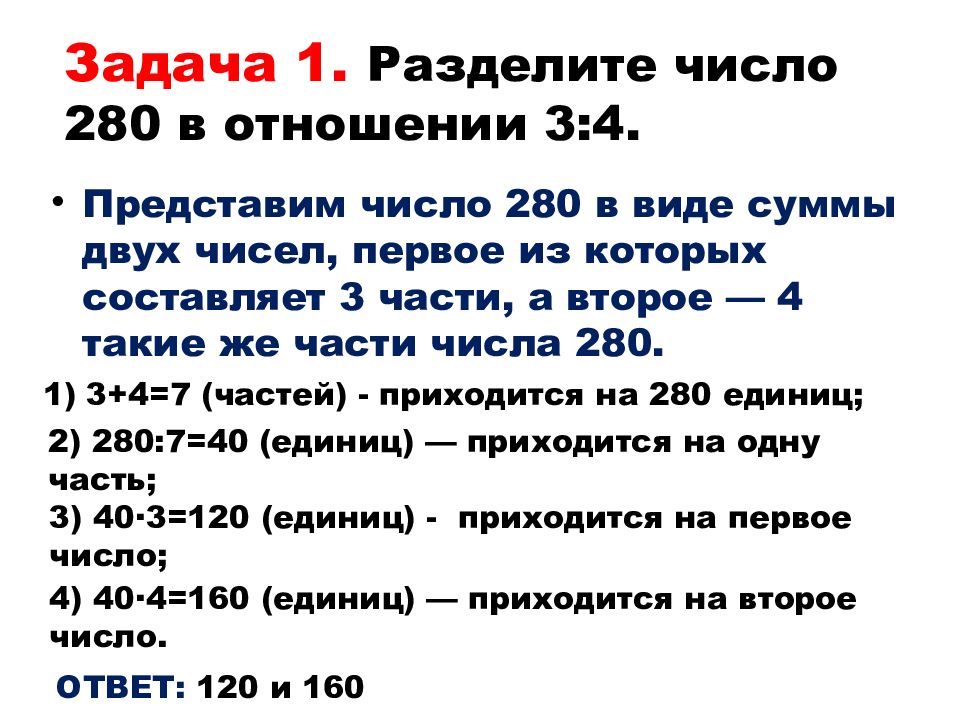 Задача 1. Разделите число 280 в отношении 3:4. Представим число 280 в виде суммы двух чисел, первое из которых составляет 3 части, а второе — 4 такие же части числа 280. 1) 3+4=7 (частей) - приходится на 280 единиц; 2) 280:7=40 (единиц) — приходится на одну часть; 3) 40 · 3=120 (единиц) - приходится на первое число; 4) 40 ·4=160 (единиц) — приходится на второе число. ОТВЕТ: 120 и 160