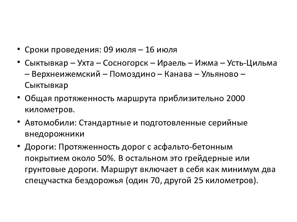 Сроки проведения: 09 июля – 16 июля Сыктывкар – Ухта – Сосногорск – Ираель – Ижма – Усть-Цильма – Верхнеижемский – Помоздино – Канава – Ульяново – Сыктывкар Общая протяженность маршрута приблизительно 2000 километров. Автомобили: Стандартные и подготовленные серийные внедорожники Дороги: Протяженность дорог с асфальто-бетонным покрытием около 50%. В остальном это грейдерные или грунтовые дороги. Маршрут включает в себя как минимум два спецучастка бездорожья (один 70, другой 25 километров).