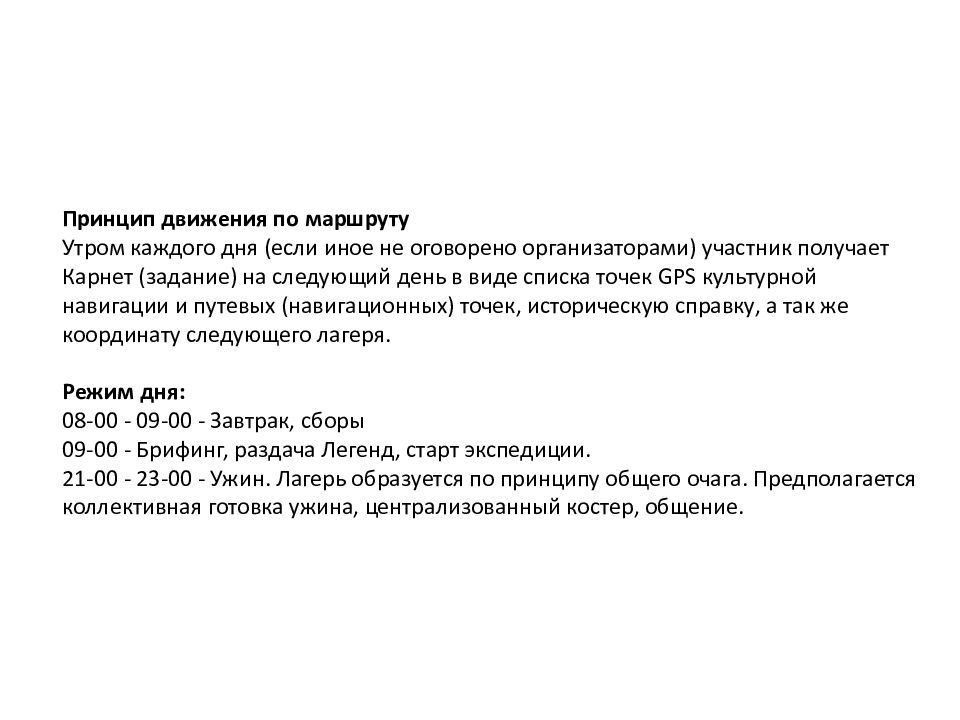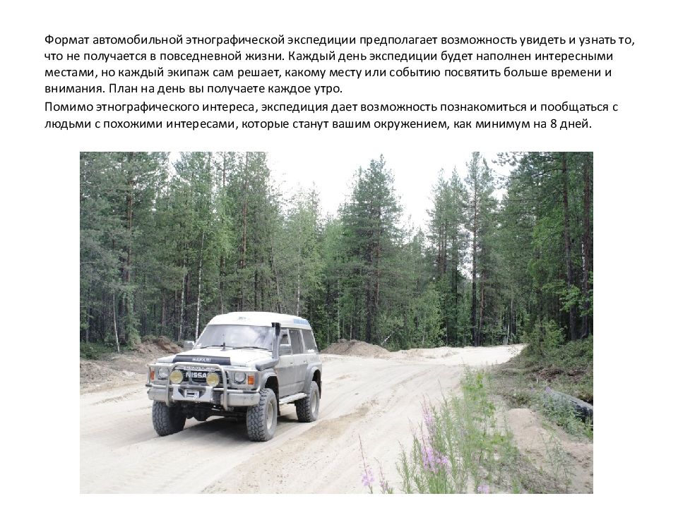 Формат автомобильной этнографической экспедиции предполагает возможность увидеть и узнать то, что не получается в повседневной жизни. Каждый день экспедиции будет наполнен интересными местами, но каждый экипаж сам решает, какому месту или событию посвятить больше времени и внимания. План на день вы получаете каждое утро. Помимо этнографического интереса, экспедиция дает возможность познакомиться и пообщаться с людьми с похожими интересами, которые станут вашим окружением, как минимум на 8 дней.