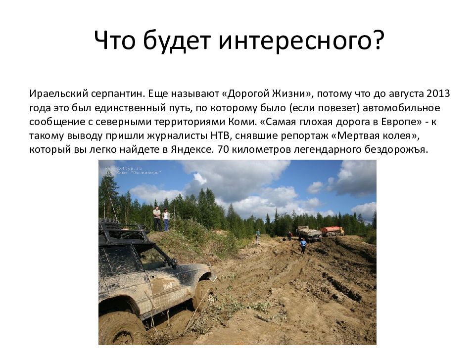 Ираельский серпантин. Еще называют «Дорогой Жизни», потому что до августа 2013 года это был единственный путь, по которому было (если повезет) автомобильное сообщение с северными территориями Коми. «Самая плохая дорога в Европе» - к такому выводу пришли журналисты НТВ, снявшие репортаж «Мертвая колея», который вы легко найдете в Яндексе. 70 километров легендарного бездорожъя.
