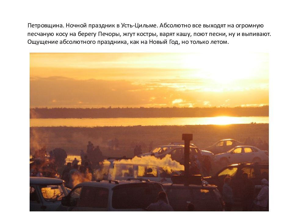 Петровщина. Ночной праздник в Усть-Цильме. Абсолютно все выходят на огромную песчаную косу на берегу Печоры, жгут костры, варят кашу, поют песни, ну и выпивают. Ощущение абсолютного праздника, как на Новый Год, но только летом.