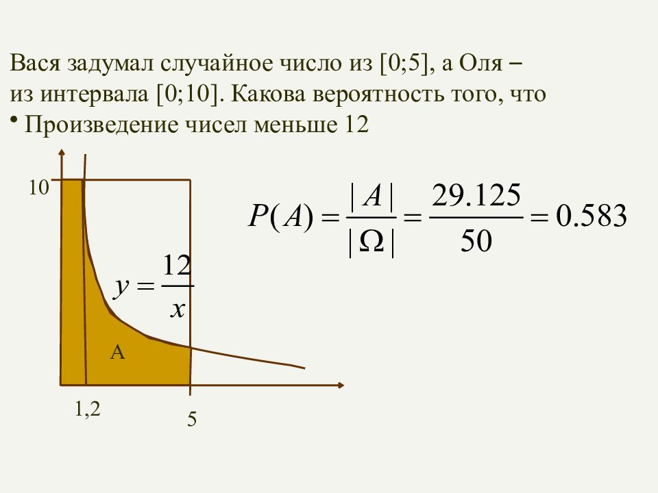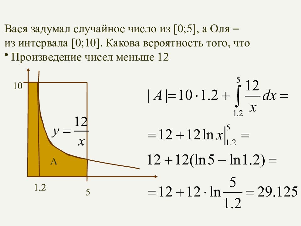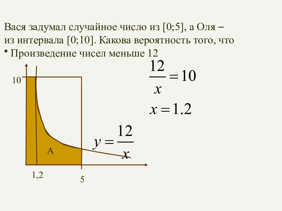 Вася задумал случайное число из [0;5], а Оля – из интервала [0;10]. Какова вероятность того, что Произведение чисел меньше 12 5 10 A – криволинейная трапеция А