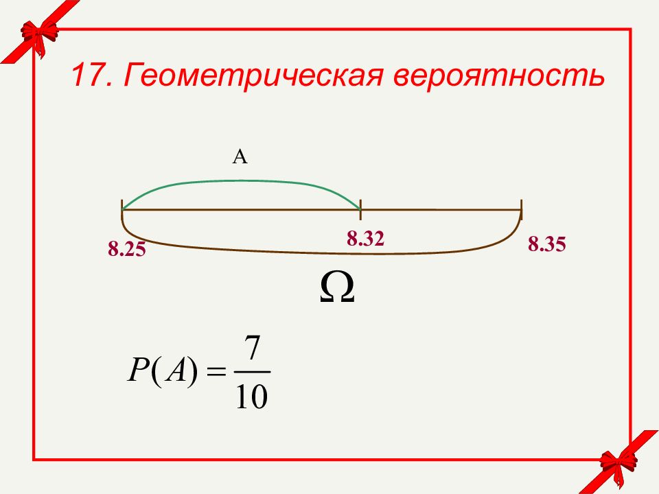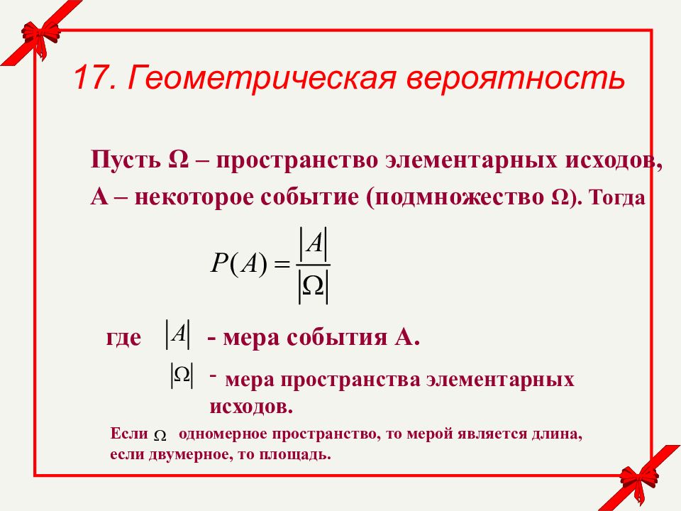 17. Геометрическая вероятность Пусть Ω – пространство элементарных исходов, A – некоторое событие (подмножество Ω ). Тогда где - мера события А. мера пространства элементарных исходов. Если одномерное пространство, то мерой является длина, если двумерное, то площадь.