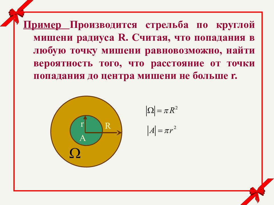 Пример Производится стрельба по круглой мишени радиуса R. Считая, что попадания в любую точку мишени равновозможно, найти вероятность того, что расстояние от точки попадания до центра мишени не больше r. R r A