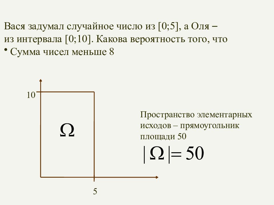 Вася задумал случайное число из [0;5], а Оля – из интервала [0;10]. Какова вероятность того, что Сумма чисел меньше 8 5 10 Пространство элементарных исходов – прямоугольник площади 50