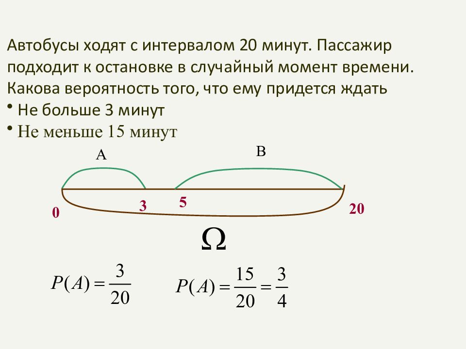 Автобусы ходят с интервалом 20 минут. Пассажир подходит к остановке в случайный момент времени. Какова вероятность того, что ему придется ждать Не больше 3 минут Не меньше 15 минут 0 20 3 A В 5