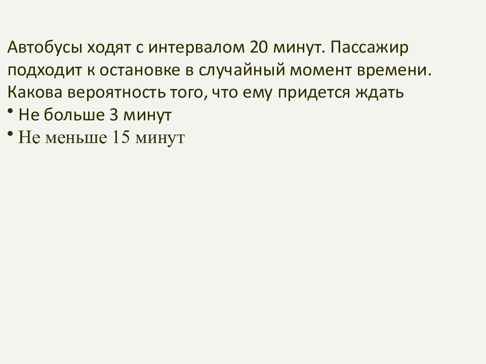 Автобусы ходят с интервалом 20 минут. Пассажир подходит к остановке в случайный момент времени. Какова вероятность того, что ему придется ждать Не больше 3 минут Не меньше 15 минут