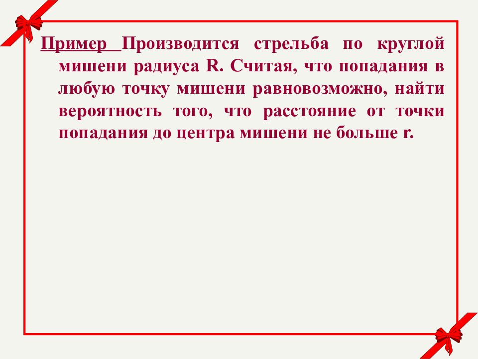 Пример Производится стрельба по круглой мишени радиуса R. Считая, что попадания в любую точку мишени равновозможно, найти вероятность того, что расстояние от точки попадания до центра мишени не больше r.