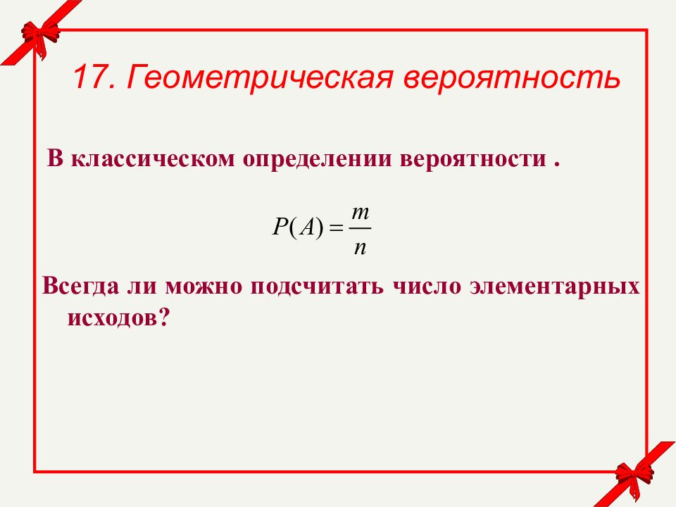 17. Геометрическая вероятность В классическом определении вероятности. Всегда ли можно подсчитать число элементарных исходов ?