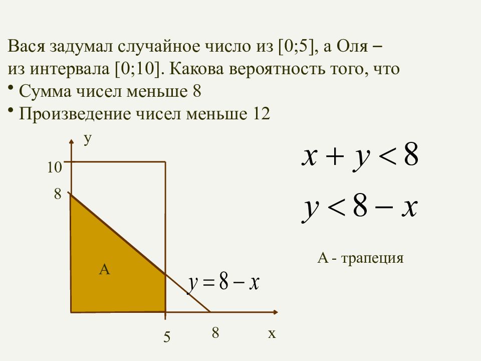 Вася задумал случайное число из [0;5], а Оля – из интервала [0;10]. Какова вероятность того, что Сумма чисел меньше 8 Произведение чисел меньше 12 5 10 x y 8 8 A - трапеция A