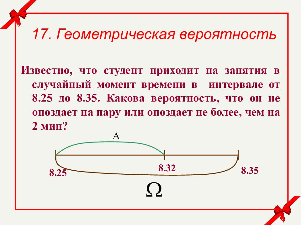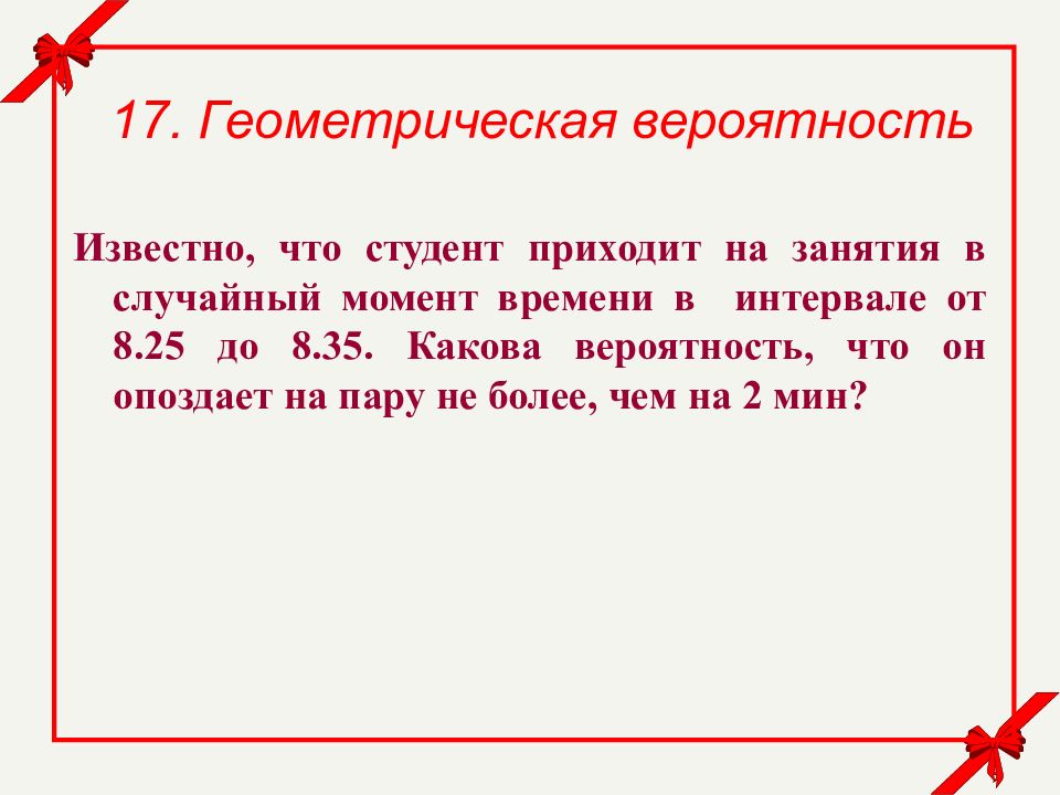 17. Геометрическая вероятность Известно, что студент приходит на занятия в случайный момент времени в интервале от 8.25 до 8.35. Какова вероятность, что он опоздает на пару не более, чем на 2 мин ?