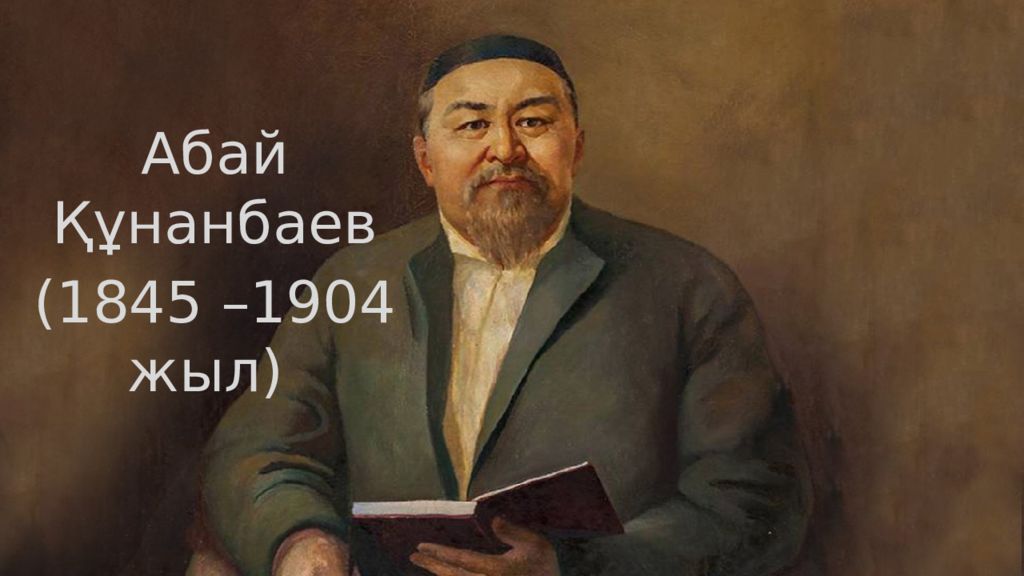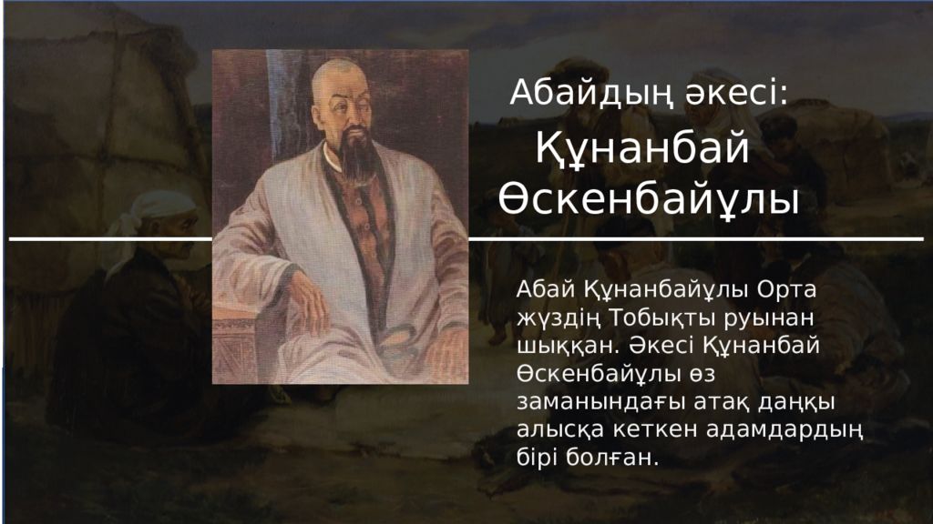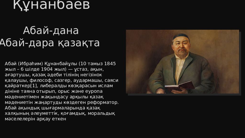 Абай Құнанбаев (1845 –1904 жыл) Абай-дана Абай-дара қазақта Абай ( Ибраһим ) Құнанбайұлы (10 тамыз 1845 жыл – 6 шілде 1904 жыл) — ұстаз, ақын, ағартушы, қазақ әдеби тілінің негізінок қалаушы, философ, сазгер, аудармашы, саяси қайраткер [1], либералды көзқарасын ислам дініне таяна отырып, орыс және еуропа мәдениетімен жақындасу арқылы қазақ мәдениетін жаңартуды көздеген реформатор. Абай ақындық шығармаларында қазақ халқының әлеуметтік, қоғамдық, моральдық мәселелерін арқау еткен Құнанбай Өскенбайұлы Абайдың әкесі: Абай Құнанбайұлы Орта жүздің Тобықты руынан шыққан. Әкесі Құнанбай Өскенбайұлы өз заманындағы атақ даңқы алысқа кеткен адамдардың бірі болған.