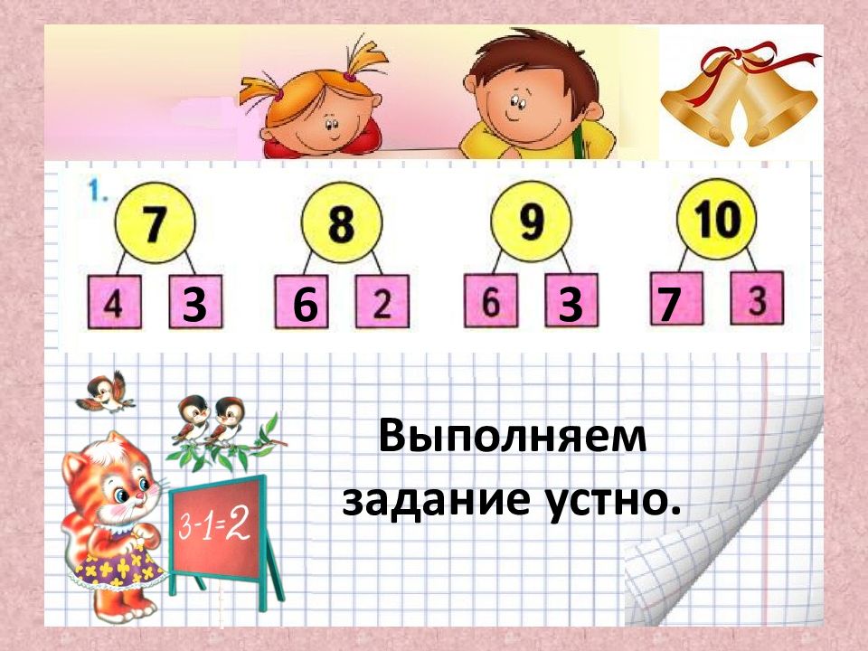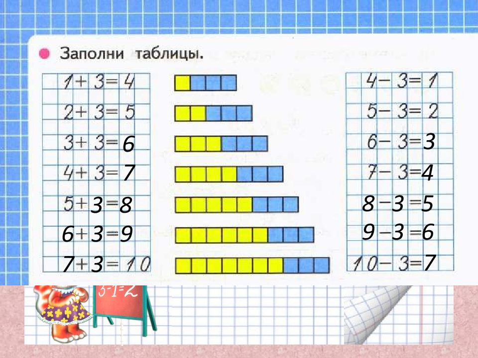 Отступаем от начала страницы слева две клеточки. Отступаем две строчки сверху страницы или от последней записи. Открываем тетрадь в клеточку. Списываем примеры из учебника в тетрадь и решаем. Проверяем себя. 1 + 3 = 4 2 + 3 = 5 3 + 3 = 6 4 + 3 = 7 5 + 3 = 8 6 + 3 = 9 7 + 3 = 10 4 - 3 = 1 5 - 3 = 2 6 - 3 = 3 7 - 3 = 4 8 - 3 = 5 9 - 3 = 6 10 - 3 = 7