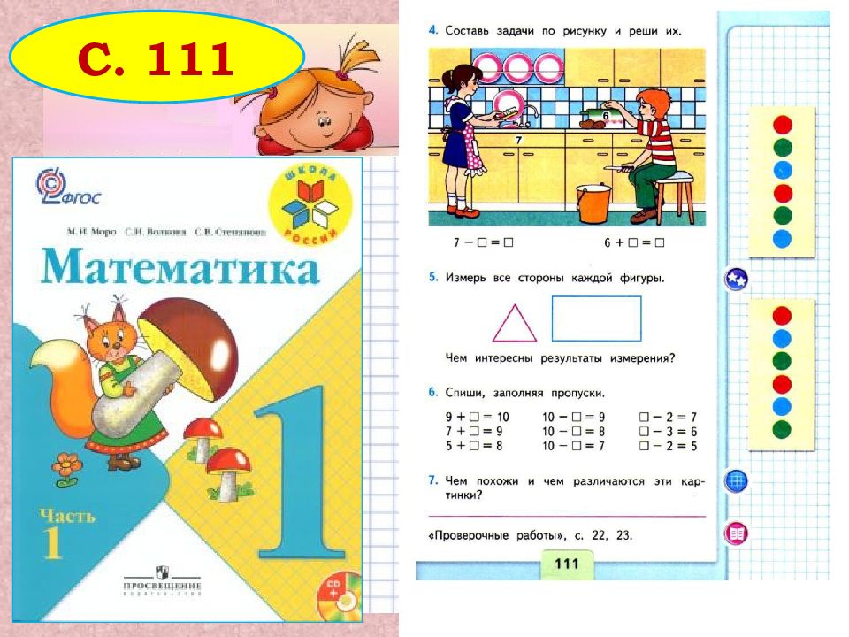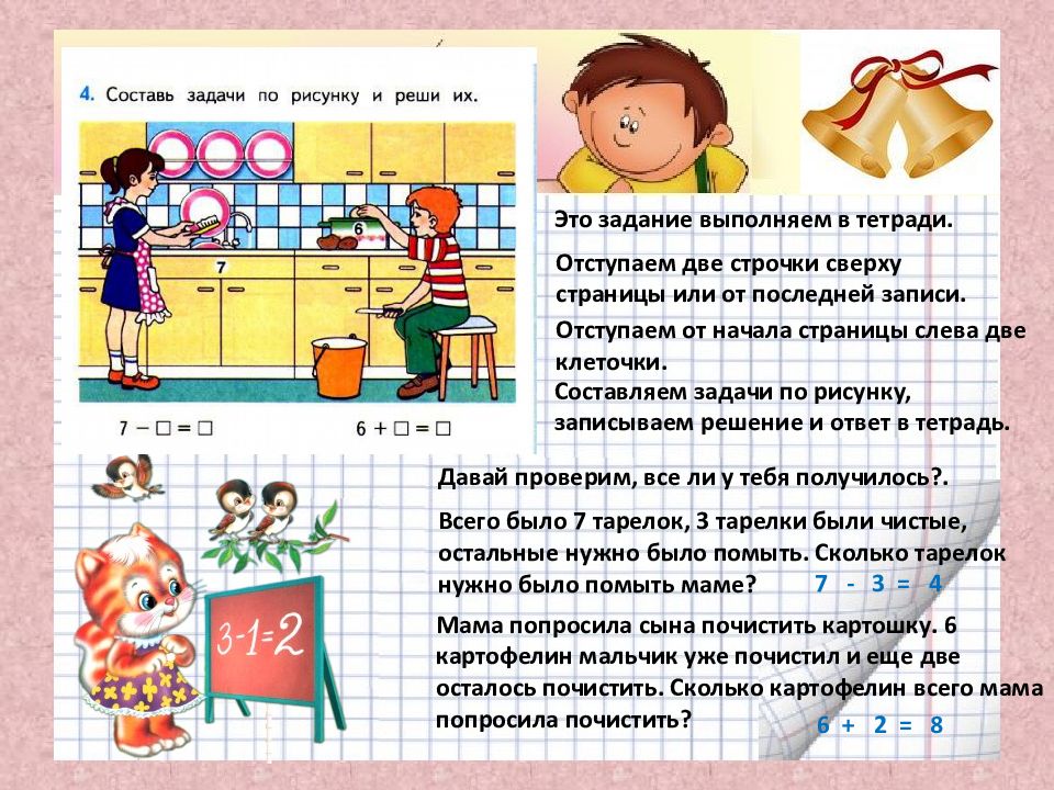Отступаем от начала страницы слева две клеточки. Отступаем две строчки сверху страницы или от последней записи. Это задание выполняем в тетради. Составляем задачи по рисунку, записываем решение и ответ в тетрадь. Давай проверим, все ли у тебя получилось?. 7 - 3 = 4 6 + 2 = 8 Всего было 7 тарелок, 3 тарелки были чистые, остальные нужно было помыть. Сколько тарелок нужно было помыть маме? Мама попросила сына почистить картошку. 6 картофелин мальчик уже почистил и еще две осталось почистить. Сколько картофелин всего мама попросила почистить?