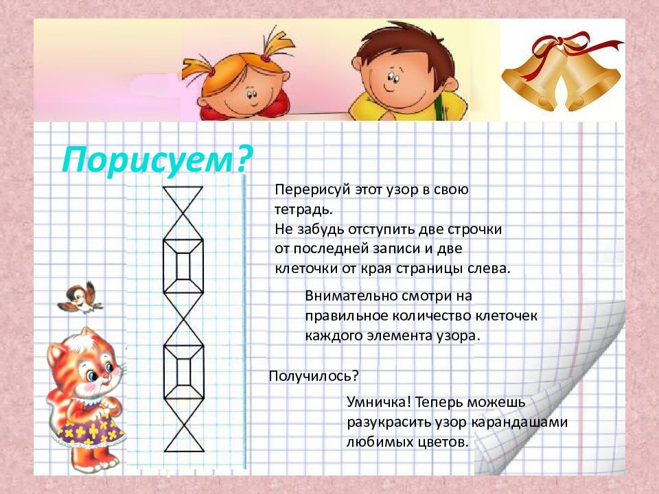 Порисуем? Перерисуй этот узор в свою тетрадь. Не забудь отступить две строчки от последней записи и две клеточки от края страницы слева. Внимательно смотри на правильное количество клеточек каждого элемента узора. Получилось? Умничка! Теперь можешь разукрасить узор карандашами любимых цветов.