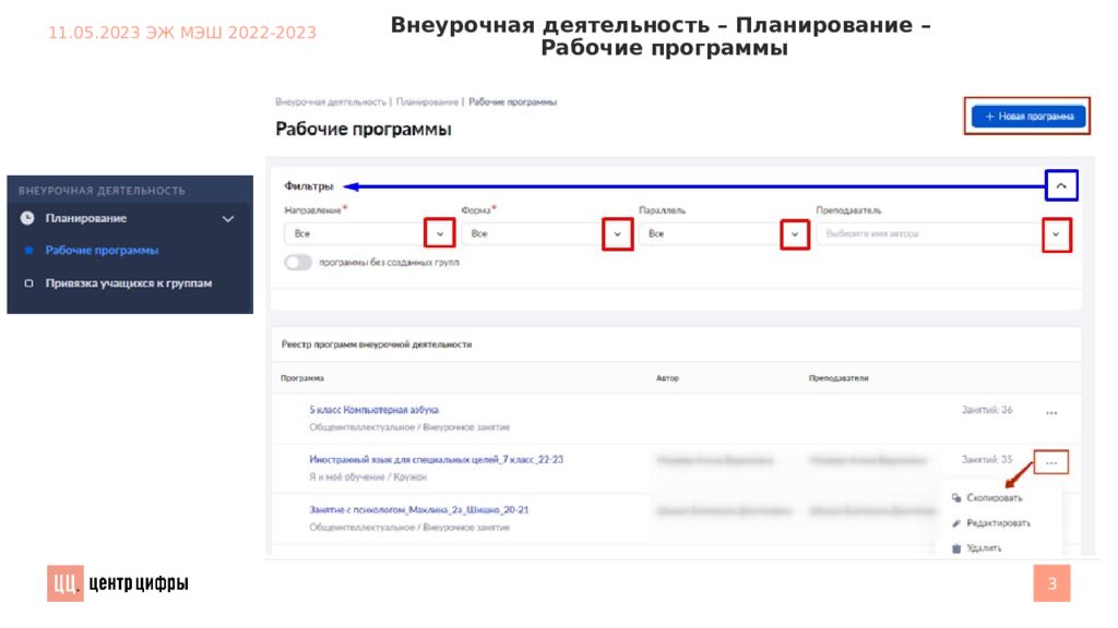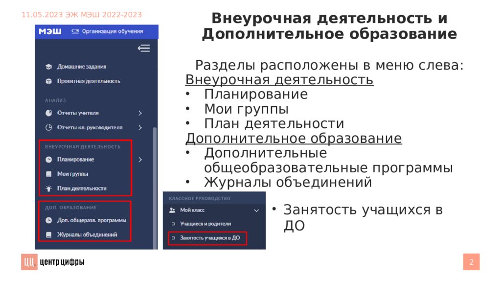 2 11.05.2023 ЭЖ МЭШ 2022-2023 Внеурочная деятельность и Дополнительное образование Разделы расположены в меню слева: Внеурочная деятельность Планирование Мои группы План деятельности Дополнительное образование Дополнительные общеобразовательные программы Журналы объединений Занятость учащихся в ДО