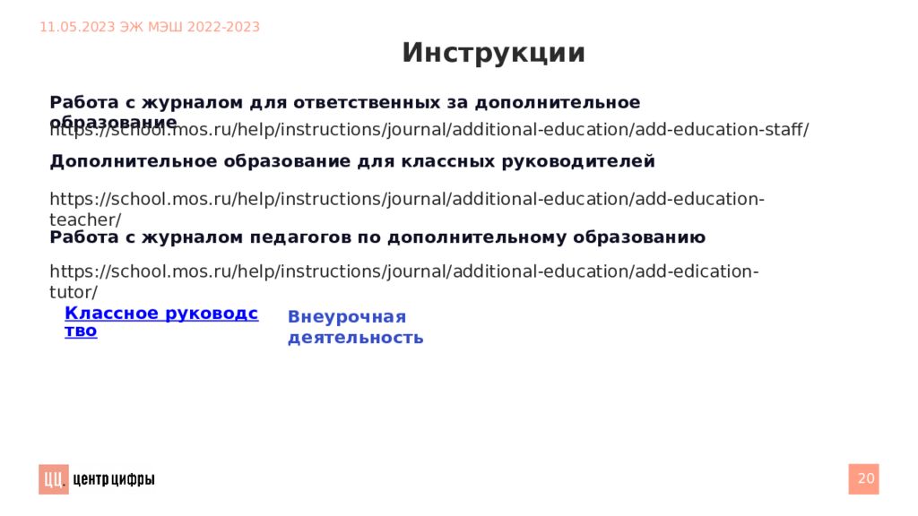 20 Инструкции Работа с журналом для ответственных за дополнительное образование https://school.mos.ru/help/instructions/journal/additional-education/add-education-staff/ Дополнительное образование для классных руководителей https://school.mos.ru/help/instructions/journal/additional-education/add-education-teacher/ Работа с журналом педагогов по дополнительному образованию https://school.mos.ru/help/instructions/journal/additional-education/add-edication-tutor/ Классное руководство Внеурочная деятельность 11.05.2023 ЭЖ МЭШ 2022-2023
