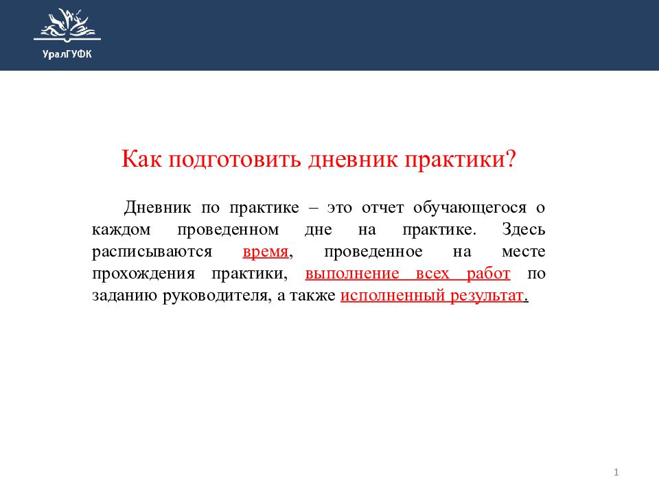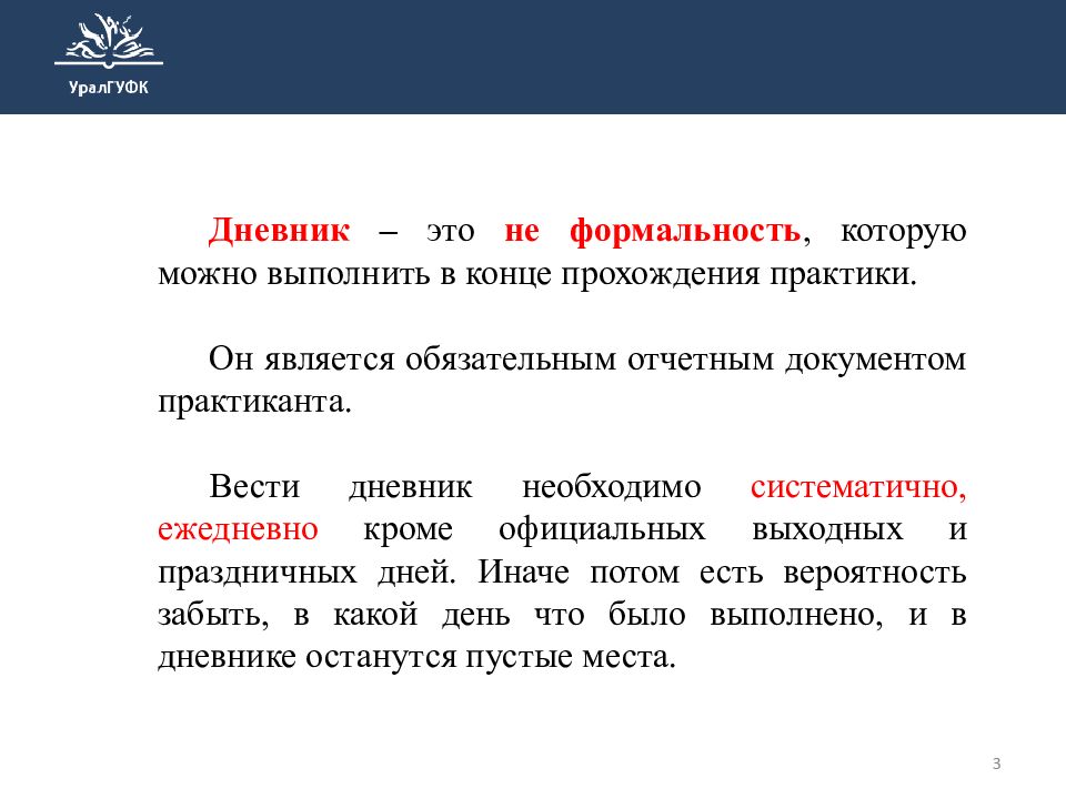 3 Дневник – это не формальность, которую можно выполнить в конце прохождения практики. Он является обязательным отчетным документом практиканта. Вести дневник необходимо систематично, ежедневно кроме официальных выходных и праздничных дней. Иначе потом есть вероятность забыть, в какой день что было выполнено, и в дневнике останутся пустые места.