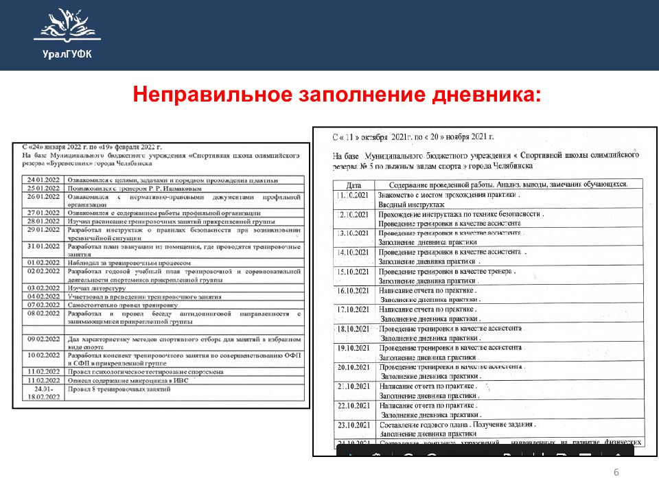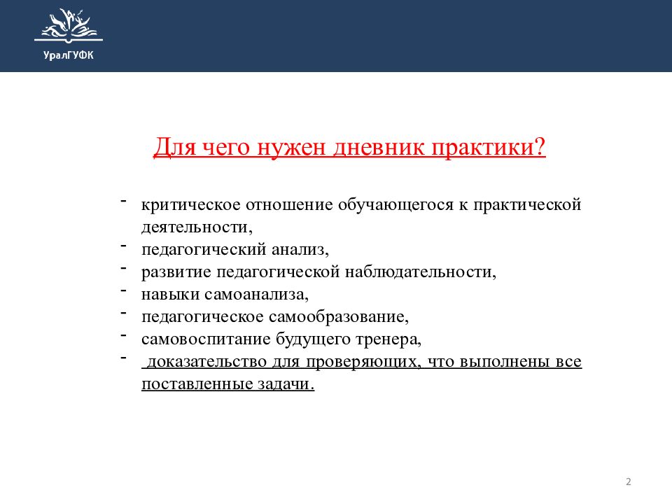 2 Для чего нужен дневник практики? критическое отношение обучающегося к практической деятельности, педагогический анализ, развитие педагогической наблюдательности, навыки самоанализа, педагогическое самообразование, самовоспитание будущего тренера, доказательство для проверяющих, что выполнены все поставленные задачи.