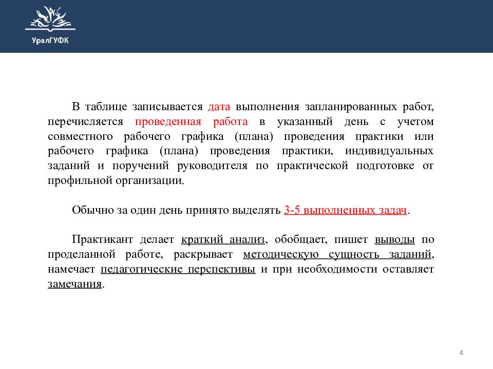 4 В таблице записывается дата выполнения запланированных работ, перечисляется проведенная работа в указанный день с учетом совместного рабочего графика (плана) проведения практики или рабочего графика (плана) проведения практики, индивидуальных заданий и поручений руководителя по практической подготовке от профильной организации. Обычно за один день принято выделять 3-5 выполненных задач. Практикант делает краткий анализ, обобщает, пишет выводы по проделанной работе, раскрывает методическую сущность заданий, намечает педагогические перспективы и при необходимости оставляет замечания.