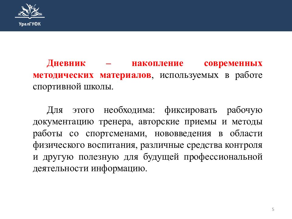5 Дневник – накопление современных методических материалов, используемых в работе спортивной школы. Для этого необходима: фиксировать рабочую документацию тренера, авторские приемы и методы работы со спортсменами, нововведения в области физического воспитания, различные средства контроля и другую полезную для будущей профессиональной деятельности информацию.