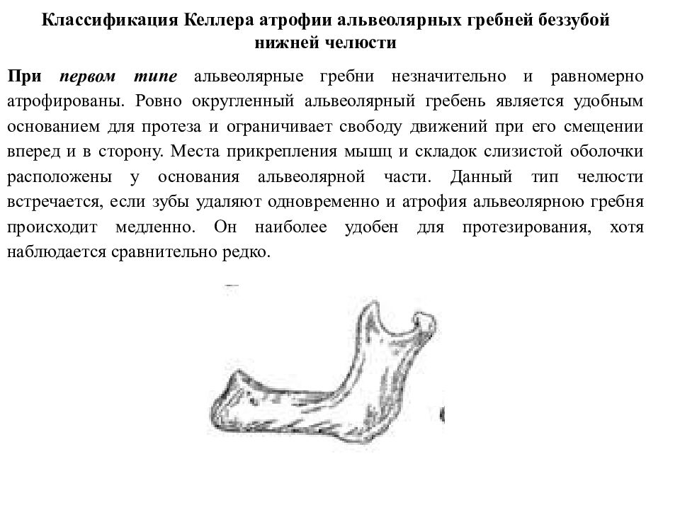 Классификация Келлера атрофии альвеолярных гребней беззубой нижней челюсти При первом типе альвеолярные гребни незначительно и равномерно атрофированы. Ровно округленный альвеолярный гребень является удобным основанием для протеза и ограничивает свободу движений при его смещении вперед и в сторону. Места прикрепления мышц и складок слизистой оболочки расположены у основания альвеолярной части. Данный тип челюсти встречается, если зубы удаляют одновременно и атрофия альвеолярною гребня происходит медленно. Он наиболее удобен для протезирования, хотя наблюдается сравнительно редко.