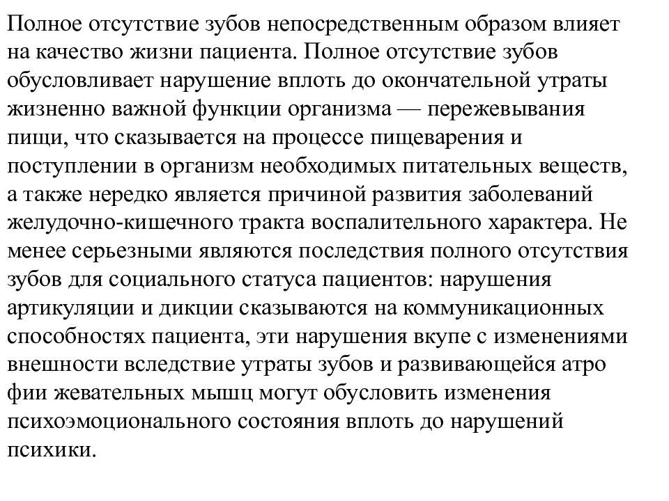 Полное отсутствие зубов непосредственным образом влияет на качество жизни пациента. Полное отсутствие зубов обусловливает нарушение вплоть до окончательной утраты жизненно важной функции организма — пережевывания пищи, что сказывается на процессе пищеварения и поступлении в организм необходимых питательных веществ, а также нередко является причиной развития заболеваний желудочно-кишечного тракта воспалительного характера. Не менее серьезными являются последствия полного отсутствия зубов для социального статуса пациентов: нарушения артикуляции и дикции сказываются на коммуникационных способностях пациента, эти нарушения вкупе с изменениями внешности вследствие утраты зубов и развивающейся атрофии жевательных мышц могут обусловить изменения психоэмоционального состояния вплоть до нарушений психики.