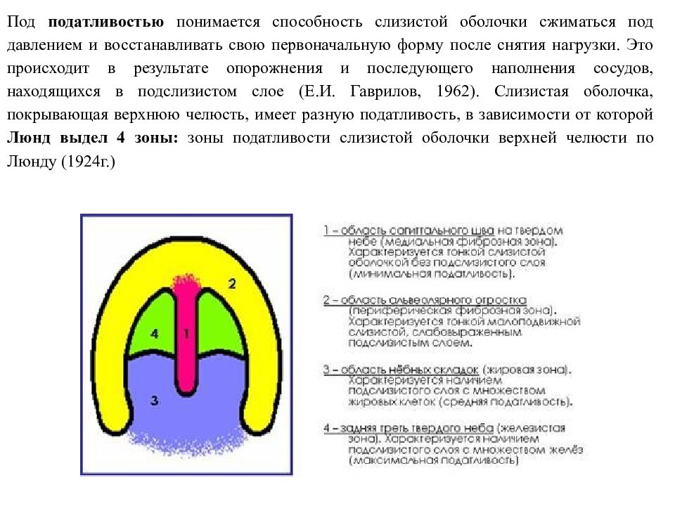 Под податливостью понимается способность слизистой оболочки сжиматься под давлением и восстанавливать свою первоначальную форму после снятия нагрузки. Это происходит в результате опорожнения и последующего наполнения сосудов, находящихся в подслизистом слое (Е.И. Гаврилов, 1962). Слизистая оболочка, покрывающая верхнюю челюсть, имеет разную податливость, в зависимости от которой Люнд выдел 4 зоны: зоны податливости слизистой оболочки верхней челюсти по Люнду (1924г.)
