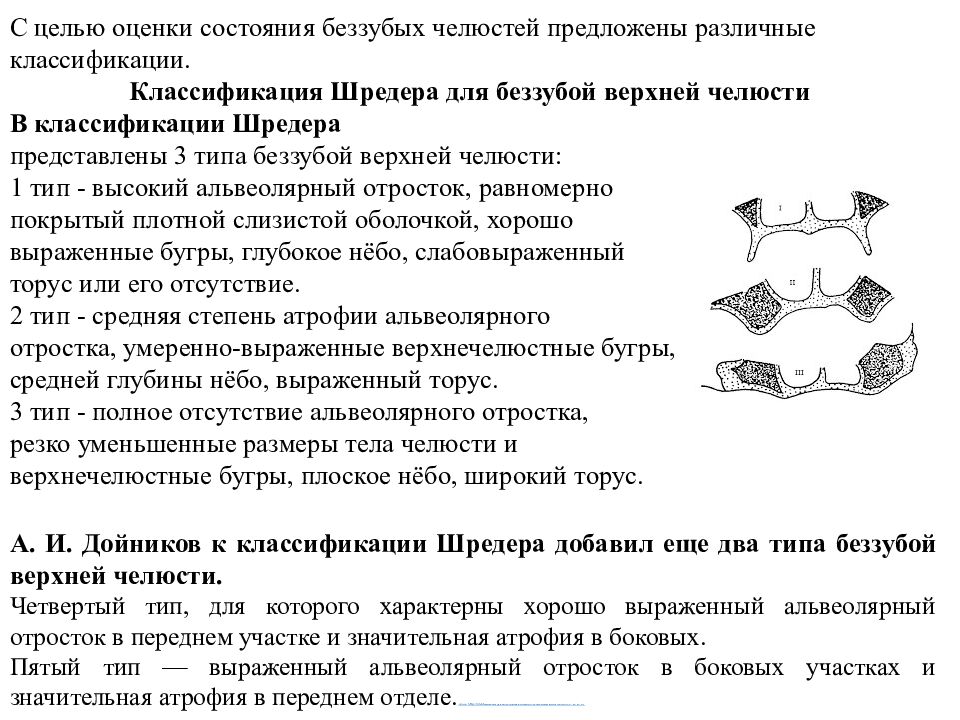 С целью оценки состояния беззубых челюстей предложены различные классификации. Классификация Шредера для беззубой верхней челюсти В классификации Шредера представлены 3 типа беззубой верхней челюсти: 1 тип - высокий альвеолярный отросток, равномерно покрытый плотной слизистой оболочкой, хорошо выраженные бугры, глубокое нёбо, слабовыраженный торус или его отсутствие. 2 тип - средняя степень атрофии альвеолярного отростка, умеренно-выраженные верхнечелюстные бугры, средней глубины нёбо, выраженный торус. 3 тип - полное отсутствие альвеолярного отростка, резко уменьшенные размеры тела челюсти и верхнечелюстные бугры, плоское нёбо, широкий торус. A. И. Дойников к классификации Шредера добавил еще два типа беззубой верхней челюсти. Четвертый тип, для которого характерны хорошо выраженный альвеолярный отросток в переднем участке и значительная атрофия в боковых. Пятый тип — выраженный альвеолярный отросток в боковых участках и значительная атрофия в переднем отделе. здесь https://dent altechnic.info/index.php/obshie-voprosy/ortopedicheskayastomatologiya/711-klassifikaciya_bezzubyh_chelyustej о КЛАССИФИКАЦИЯ БЕЗЗУБЫХ ЧЕЛЮСТЕЙ